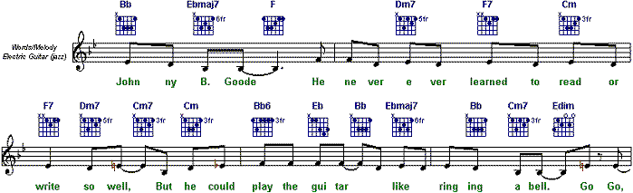 MIDI and Karaoke files do not generally contain any information about chords or chord progressions. MidiIllustrator however, can intelligently analyse the music to determine which chords are being played in each beat or measure within the score. With this information MidiIllustrator can then display a combination of chord names and guitar fret graphics above the top stave.